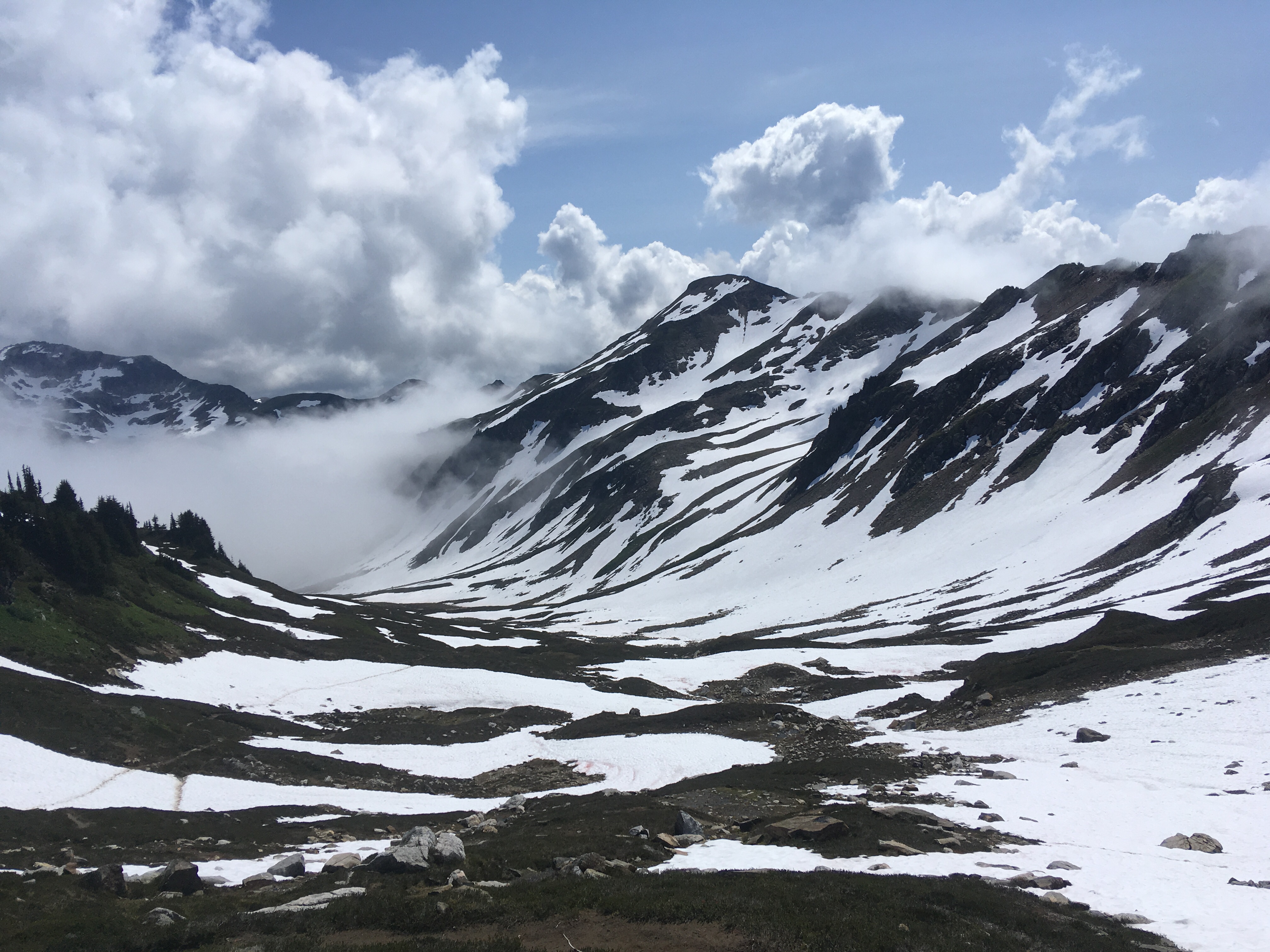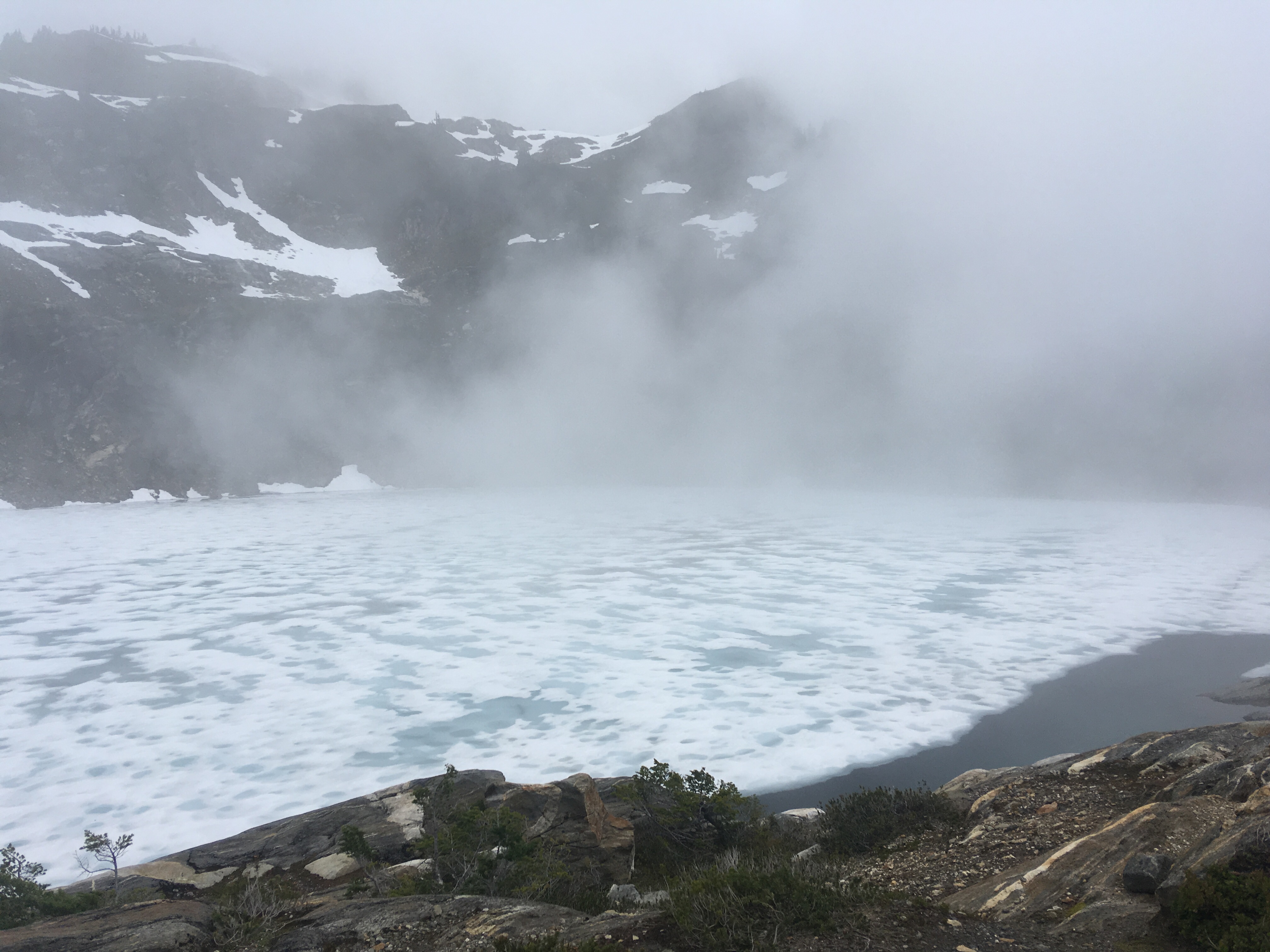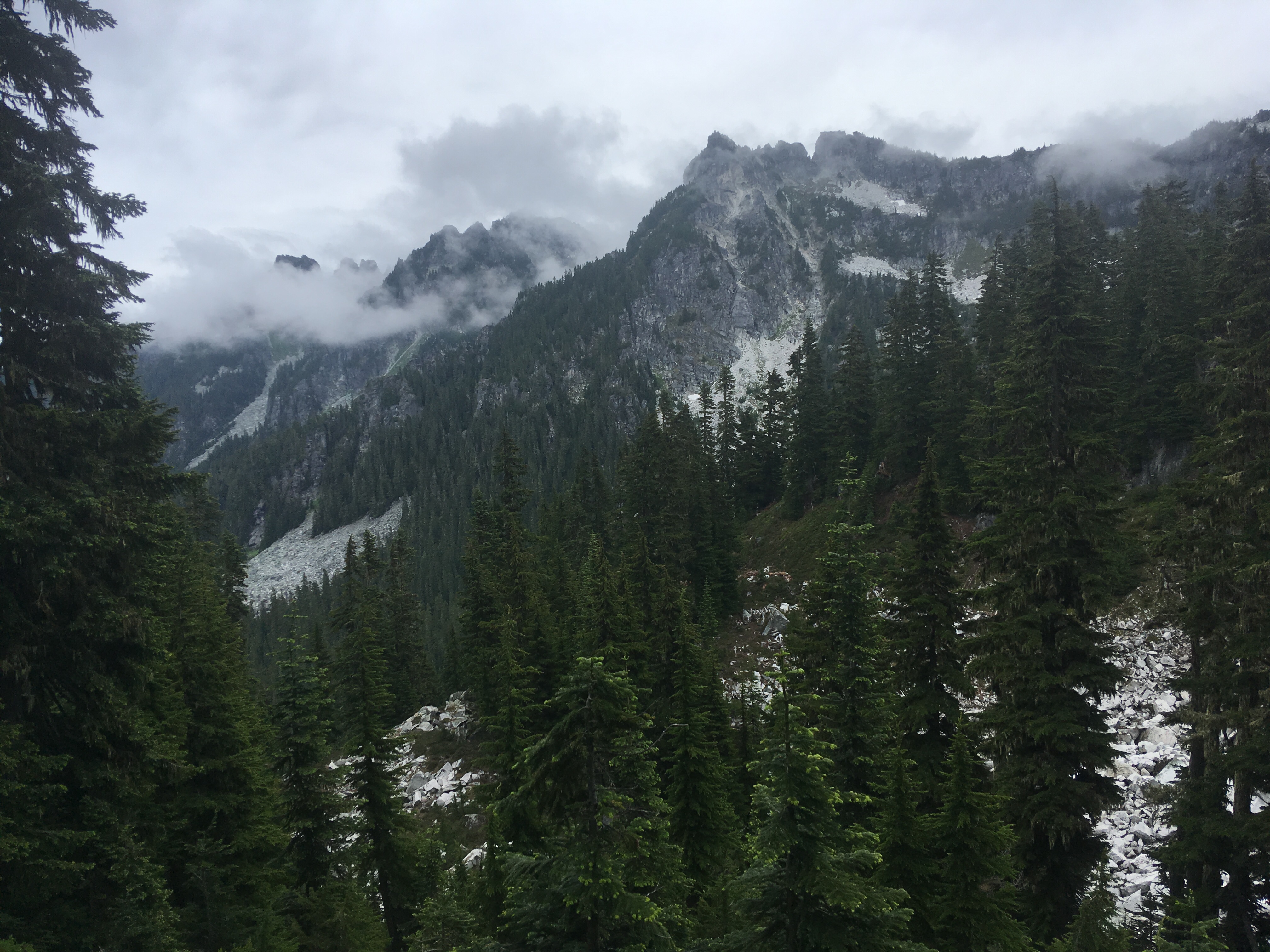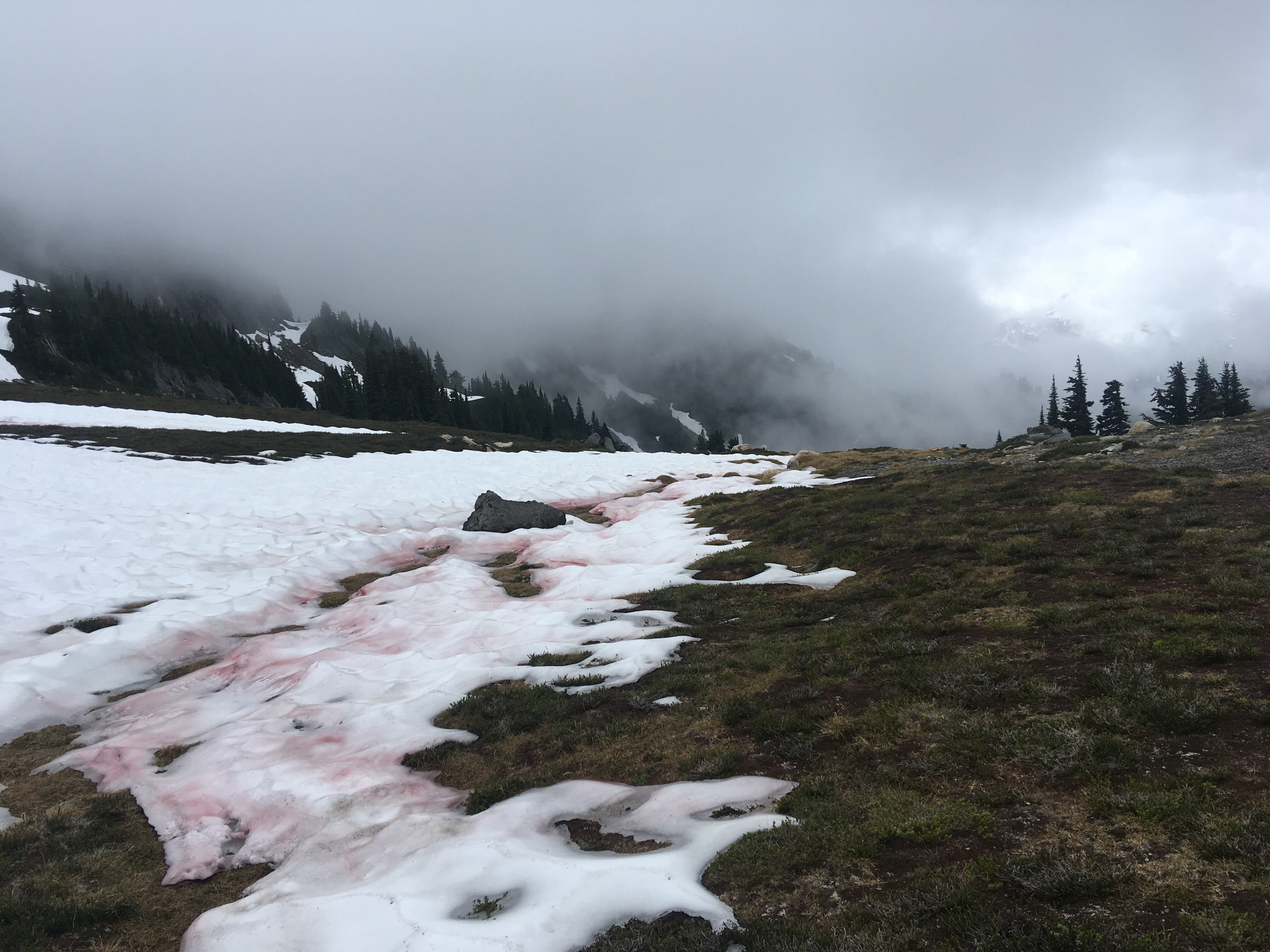 While it may be summer in the rest of the country, in the Cascades of Northern Washington it is still early spring. We spent at least 4 of the last 7 days walking through low hanging clouds/fog/mist and the other 3 we saw a mixture of sun and showers. We also saw our first bear and finally figured out what animal was making this weird womping sound we’d been hearing since the first day. It was a grouse. Also, another mystery was solved when another hiker told us why the snow was red. Apparently, it is algae, not the blood of fallen hikers as we suspected.
