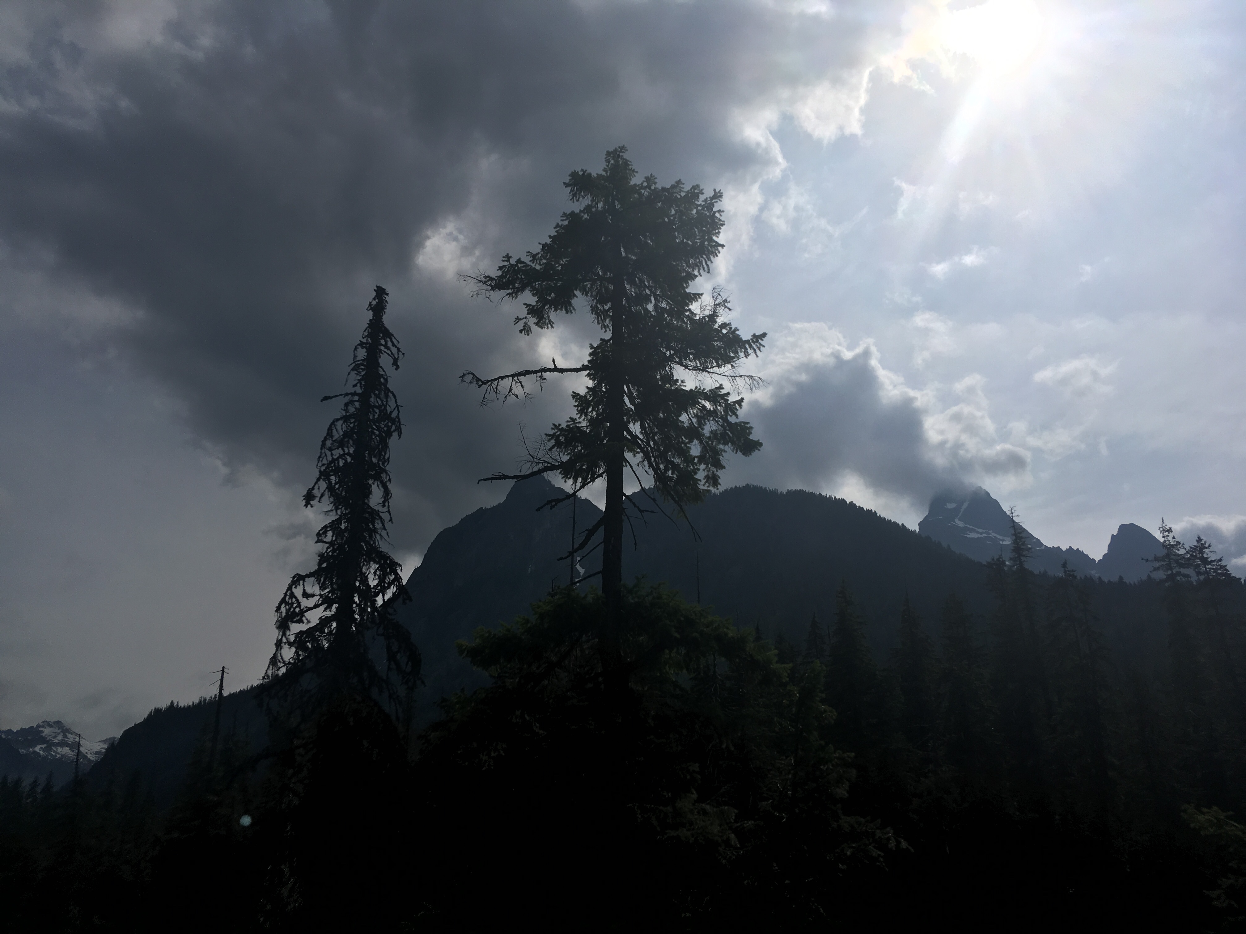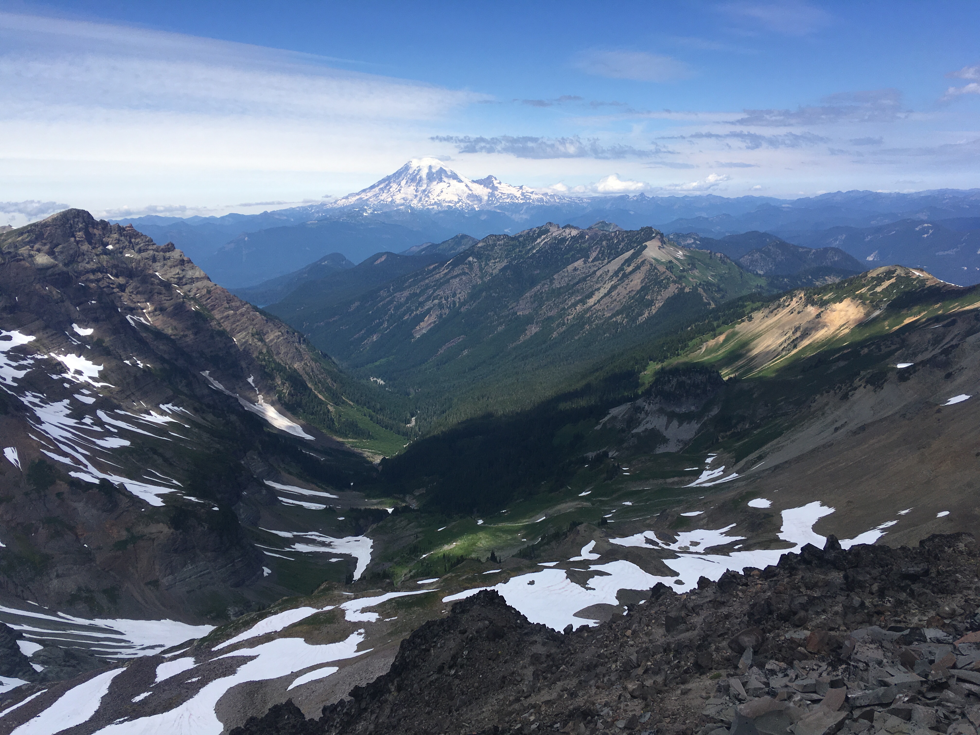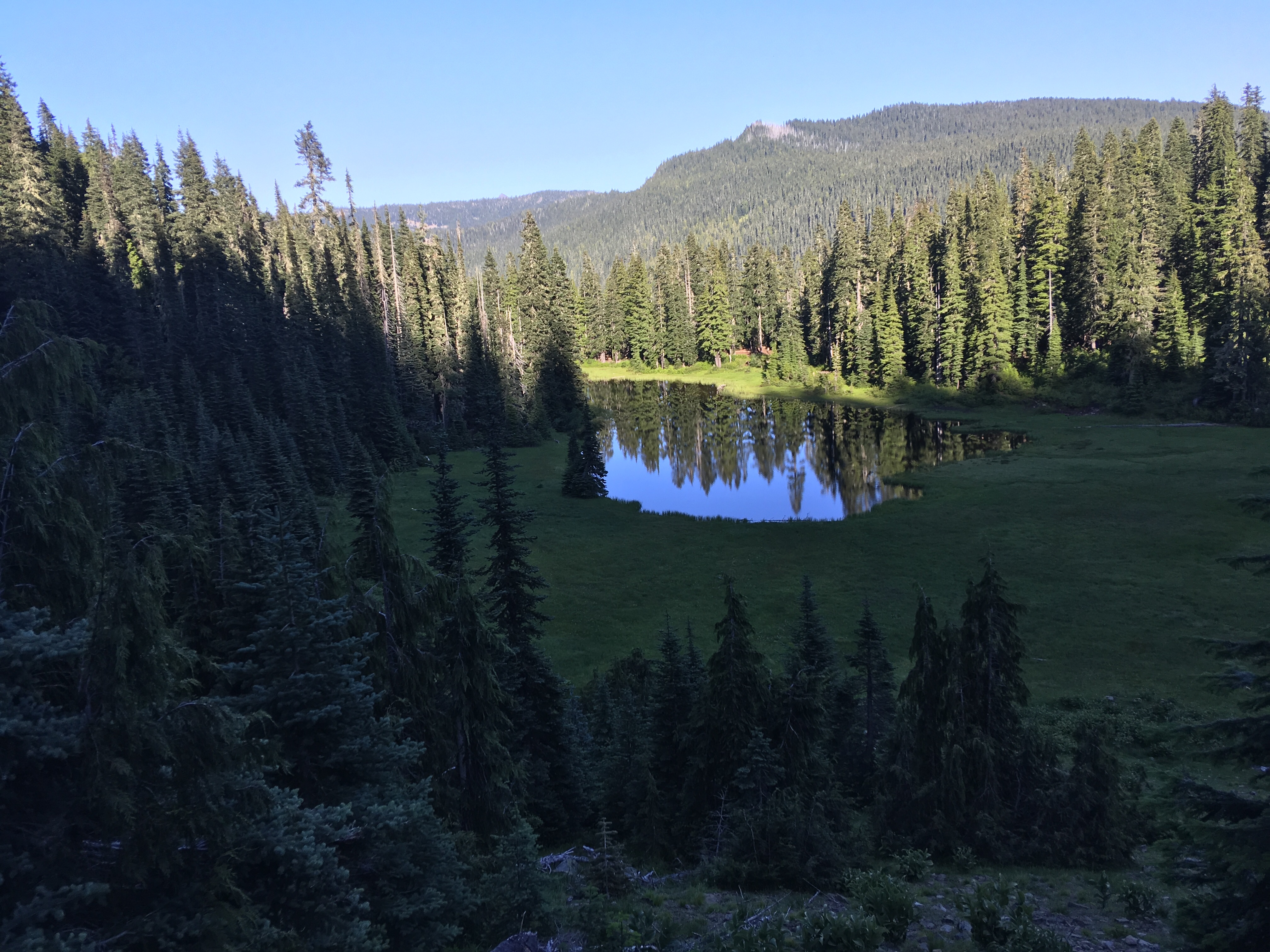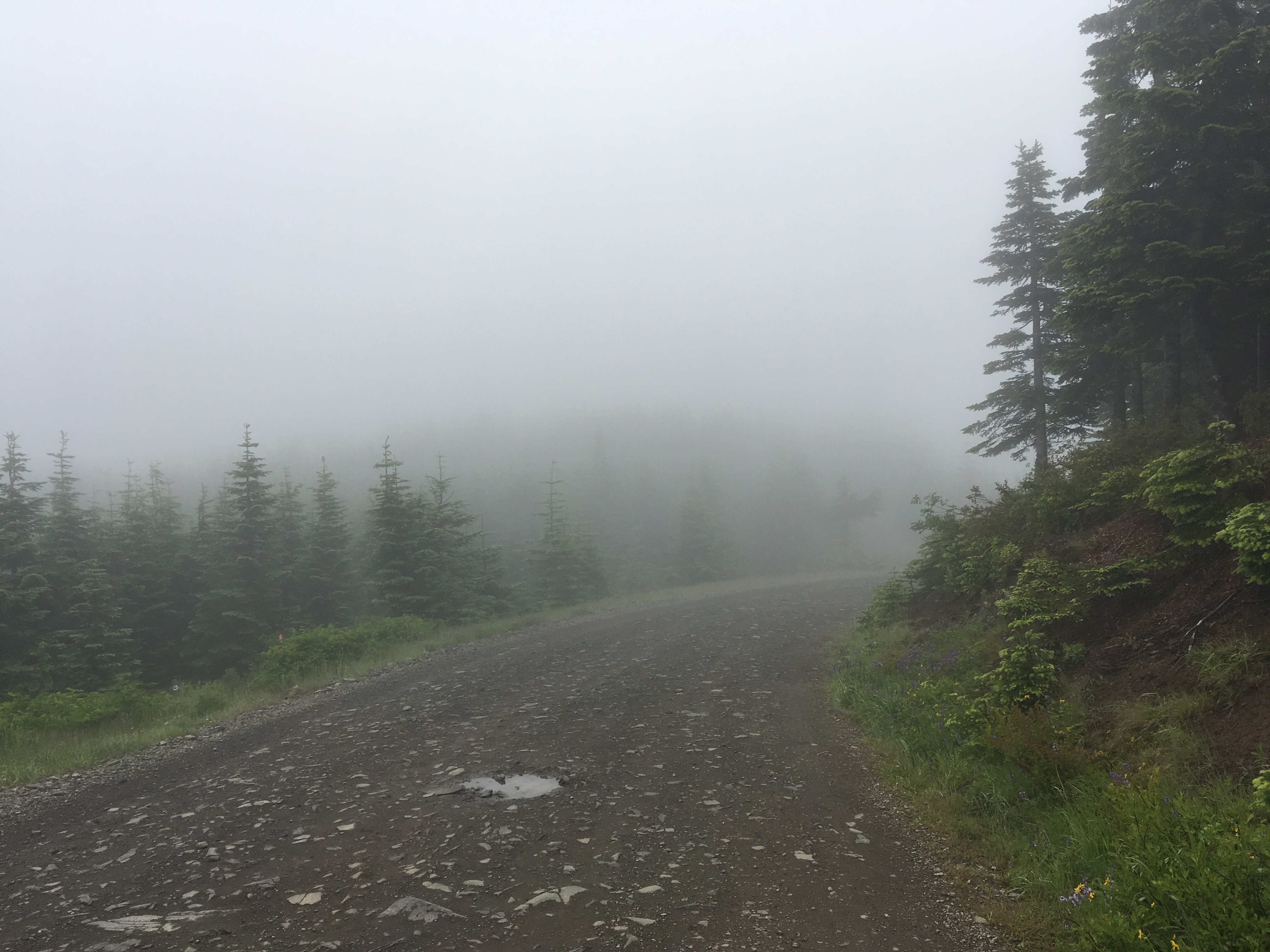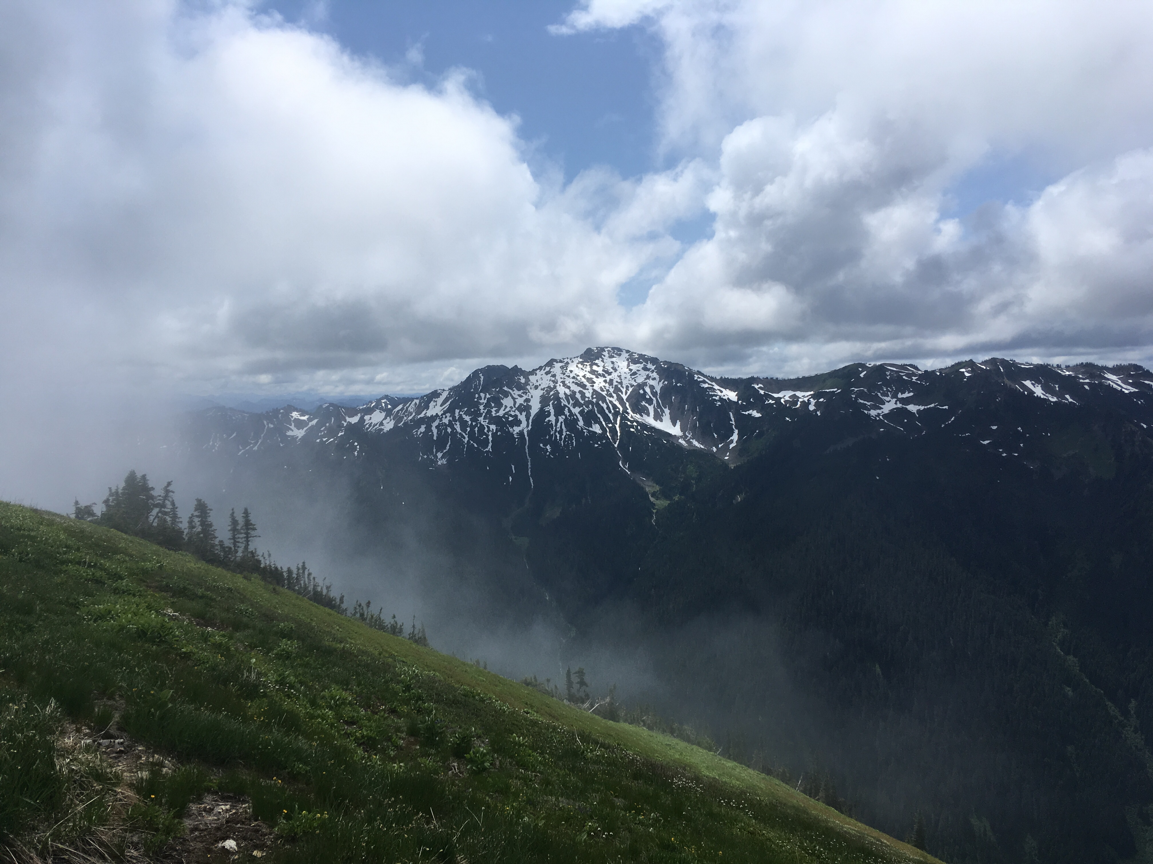 While it may be summer in the rest of the country, in the Cascades of Northern Washington it is still early spring. We spent at least 4 of the last 7 days walking through low hanging clouds/fog/mist and the other 3 we saw a mixture of sun and showers. We also saw our first bear and finally figured out what animal was making this weird womping sound we’d been hearing since the first day. It was a grouse. Also, another mystery was solved when another hiker told us why the snow was red. Apparently, it is algae, not the blood of fallen hikers as we suspected.